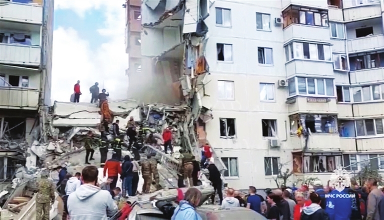 这张俄罗斯紧急情况部5月12日发布的视频截图显示,救援人员在别尔哥罗德市居民楼坍塌现场工作。新华社 发