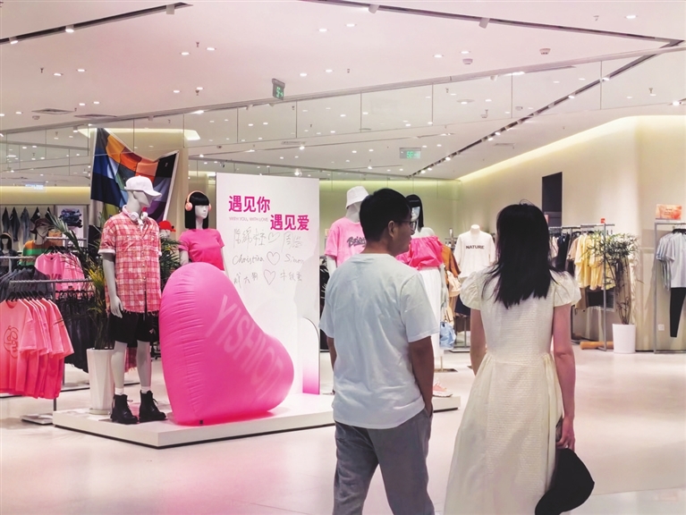在以纯服装专柜门口,巨大的粉色桃心气球与粉色系情侣装十分吸睛,写有一对对情侣名字的“遇见你 遇见爱”爱情展板十分应景。旁边的“森马”服装专柜也立起了浪漫的粉色桃心展示牌。不少店铺推出“消费满520元减80元,满1314元减220元”活动。