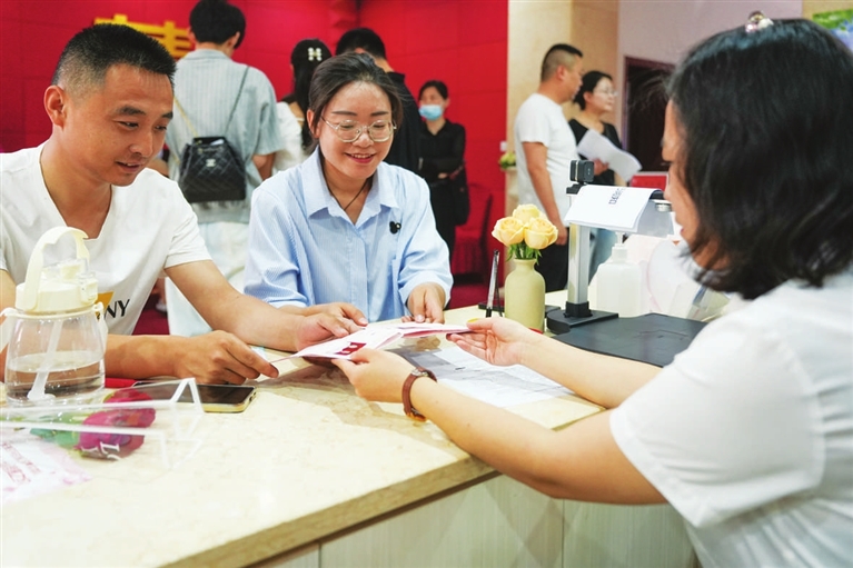 因“520”与“我爱你”谐音,许多新人选择在这个浪漫的日子办理结婚登记手续。图为5月20日,万柏林区婚姻登记大厅内,领证的新人络绎不绝。 邓寅明 摄
