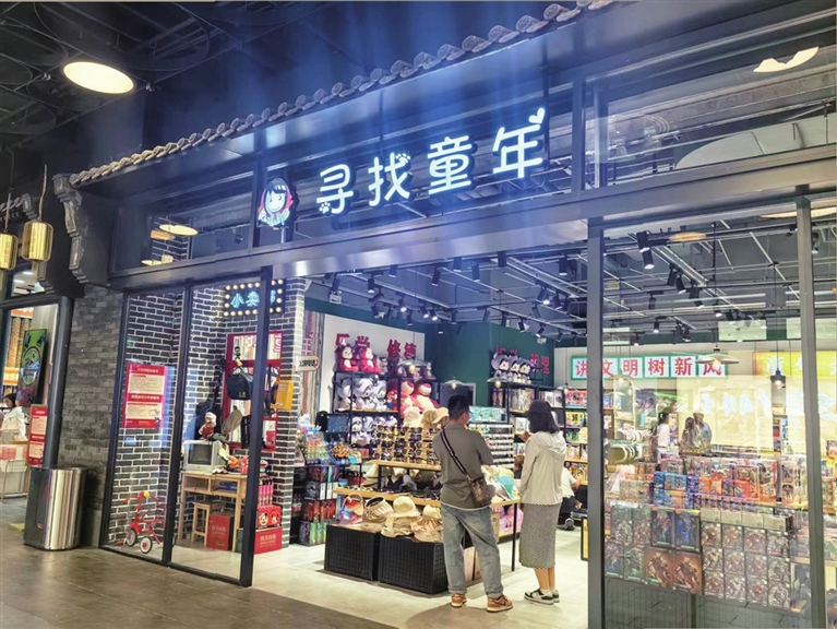 而在食品街的一家童年杂货店,红色的砖墙、绿色的窗框搭配着玻璃上“小卖部”的红色大字。脚踏缝纫机、收音机、卖冰糕的箱子、小人书……各种怀旧物件仿佛把人一下子拉回到上世纪八九十年代。除了铁皮青蛙、弹弓、竹蜻蜓、沙包等怀旧玩具,“万紫千红”“友谊”“咏梅”“孩儿面”润肤霜等各色日化用品,“239”饮料、大大卷泡泡糖、果丹皮等怀旧食品都陆续给人们带来一波波“回忆杀”。