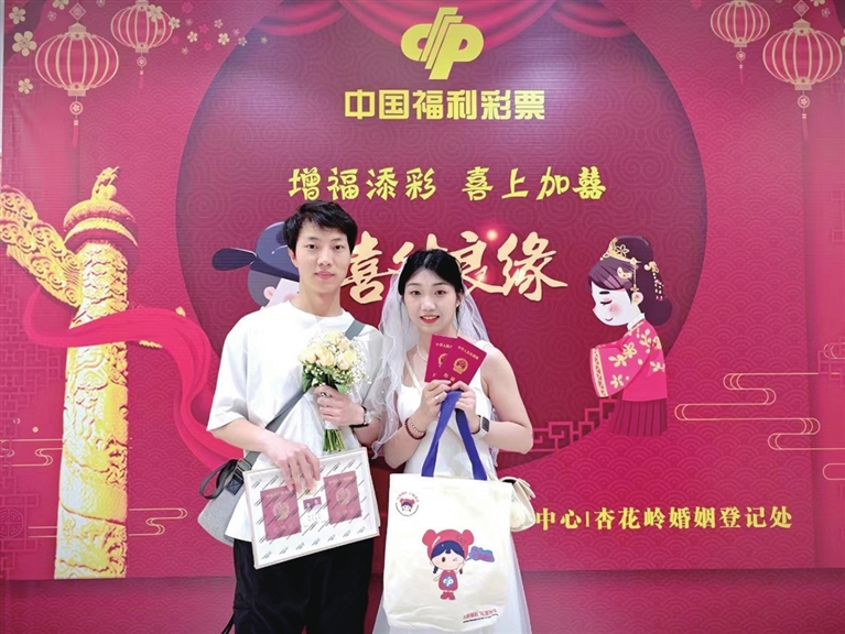 吉祥物“福宝”、精美的相框摆台、囍勺、帆布袋,一对对新人经过太原市福利彩票发行中心的礼品领取处时,视线总会停在这些实物上。“恭喜你们喜结良缘,这份礼物是送给你们的,祝福你们!从今天起,一起用爱书写幸福的故事吧。”太原市福利彩票发行中心的工作人员为领取结婚证的新人送出礼物的同时,也送上真诚的祝福语。