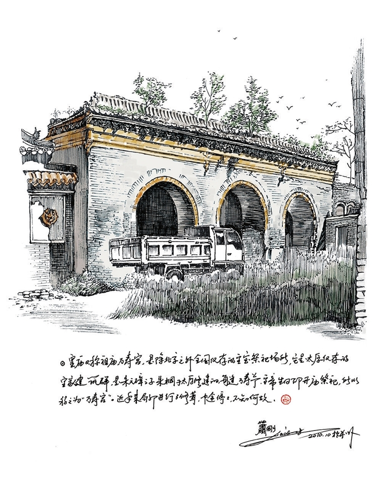 出二号院西门,向北拐弯处有一面古老的影壁,影壁北面是一片屋顶上蒿草丛生的建筑,深秋和初冬时节荒草随风倒伏,衰败而凌乱,画面感很强。若干年后,阅读萧刚绘著的一本名叫《太原名街老巷》素描绘本时我才知道,那时日日路过的那片旧建筑,黄色的琉璃瓦顶,龙形装饰,居然是我国古代建筑等级最高的皇家建筑,且山西省内仅此一例。周边居民叫它万寿宫或皇庙。一查资料,该建筑准确的名称正好就是民间俗称的集合体,就叫万寿宫皇庙。具体始建年代不详,大致建于明朝晋王朱棡就藩太原前后,距今已有600多年的历史。