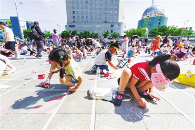 青年宫演艺中心前广场热闹非凡、童趣盎然,孩子们或蹲或坐,用五颜六色的粉笔,在身下的一平方米区域内尽情挥洒想象力。粉笔上下飞舞,梦想和希望融入每一笔、每一画,一幅幅图画显出雏形,有的描绘出未来的城市风光,有的勾勒出温馨的家庭场景,有的展现出祖国的大好河山……孩子们以独特的视角,将路面变成了一块色彩斑斓的巨幅画布。这些粉笔画作品充满了活力和创意,展现了我市少年儿童的艺术风采和精神风貌。