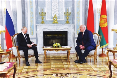 5月24日,俄罗斯总统普京(左)与白俄罗斯总统卢卡申科在白俄罗斯首都明斯克举行会谈。 普京24日在白俄罗斯首都明斯克表示,支持在当前现实基础上与乌克兰谈判。普京23日至24日对白俄罗斯进行访问。新华社 发