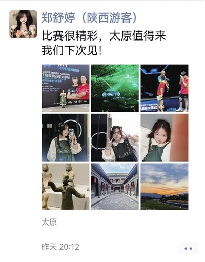 “徐沟灌肠、晋祠元宵、桂花米糕……太原的特色小吃太好吃;晋祠、山西青铜博物馆、太原植物园……好玩的地方掰着指头也数不完,一两天时间根本玩不够。”郑舒婷在延安上大学,利用双休日“特种兵式”观赛加旅游,虽然时间很紧,但她认为很值,就是略有遗憾,太原许多好吃好玩的还没有体验,她对下次再来充满期待。晚11时许,怀着对太原深深的眷恋踏上归程,列车上,她在微信朋友圈“深情告白”:“比赛很精彩,太原值得来,我们下次见!”