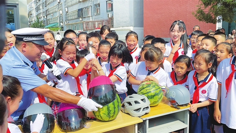 交警为孩子们讲解交通安全知识。