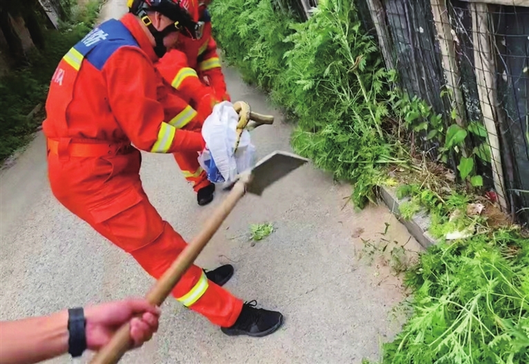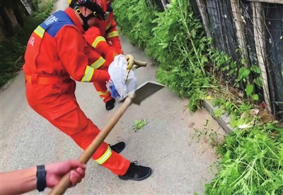 接到报警后,消防救援人员赶到现场。在报警人的带领下,找到蛇出没的地方。这里有一道简易栅栏,凭借着栅栏隔离,加上附近绿植较多,蛇很好地藏匿起来,不太好找。居民们担心,夏天小孩在外面玩耍,一旦被蛇咬伤,后果难料,所以请消防救援人员帮忙,将蛇控制,另择它处放生,互不干扰。