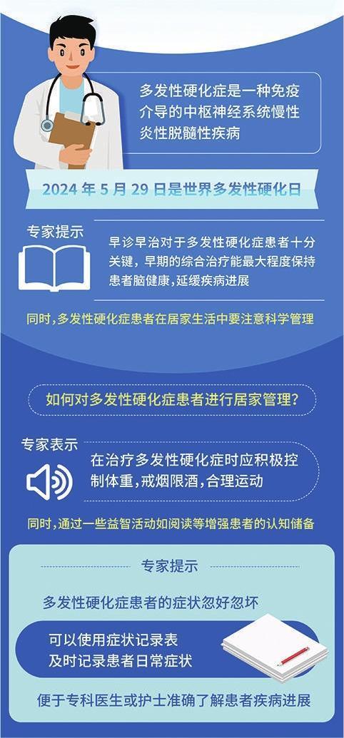 新华社北京5月29日电(记者李恒)多发性硬化症是一种免疫介导的中枢神经系统慢性炎性脱髓性疾病。今年5月29日是世界多发性硬化日。专家提示,早诊早治对于多发性硬化症患者十分关键,早期的综合治疗能最大程度保持患者脑健康,延缓疾病进展。同时,多发性硬化症患者在居家生活中要注意科学管理。
