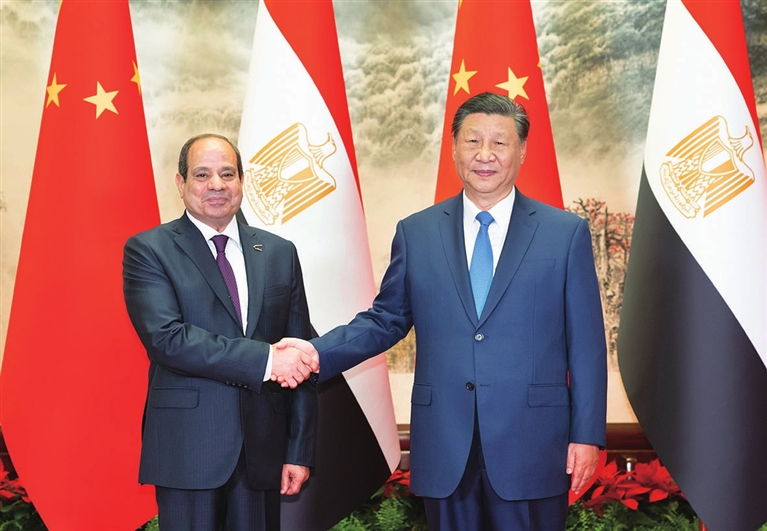 习近平指出,68年前,埃及在阿拉伯和非洲国家中率先同新中国建交。任凭国际形势风云变幻,两国始终相互信任、真诚合作、携手发展。今年是中埃建立全面战略伙伴关系10周年。10年来,我同塞西总统共同引领双边关系蓬勃发展。中埃关系已经成为中国同阿拉伯、非洲、伊斯兰和发展中国家团结协作、互利共赢的生动写照。新形势下,建设更具内涵、更有活力的中埃关系,符合两国人民共同期待。中方愿同埃方不断深化互信,推进合作,构建面向新时代的中埃命运共同体,为地区乃至世界和平、稳定、发展、繁荣贡献力量。