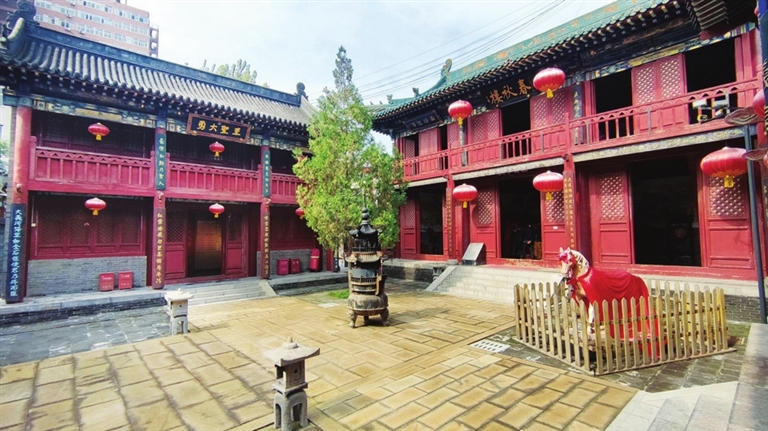 关于庙之创建,坊间还有故事。传说,宋太平兴国七年(982),宋朝大将潘美在太原府城西城墙内修建关公庙宇,为大关帝庙之肇始。时因晋阳城被毁,潘美以唐明镇(今羊市街一带)为依托,新建了太原城。在建城中,不知何故,城的东、南、北三面城墙很快建成,唯有西城墙屡建屡塌。面对晋阳城已毁,辽兵虎视眈眈,寻机南侵,西城墙事关重大,潘美焦虑犯愁。一日,关公在云中显圣,跨其赤兔马在城西跑了一圈,然后指着马迹道:“就沿此迹筑墙吧!”话毕,销声匿迹。工匠们闻言而动,重新兴土动工,夯基砌筑,很快就筑好西城墙。为感念关公点化之功,人们就在太原城内修建了大关帝庙,每逢重大节日,祭祀供奉。如今,大关帝庙同太原府城内的文庙、唱经楼、崇善寺、纯阳宫等形成了完整的历史风貌区,传承了历史文脉,留住了城市记忆。