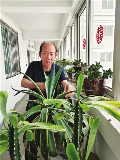 在杏花岭区建北高层小区,还未进入范世林家中,就看到楼道中摆放着满满当当的花。龙骨、龙须、芦荟、玉麒麟、擎天柱、虎刺梅等一些南方的花草,错落有致地摆放着,绿意盎然。“这些花都比较耐旱,稍加管理,适当浇水,便能日渐长大。”范世林如数家珍,对每一种花草的习性了如指掌。由小到大、由少到多,品种也日渐丰富,家里放不下了,他就把花摆到楼道里美化环境。