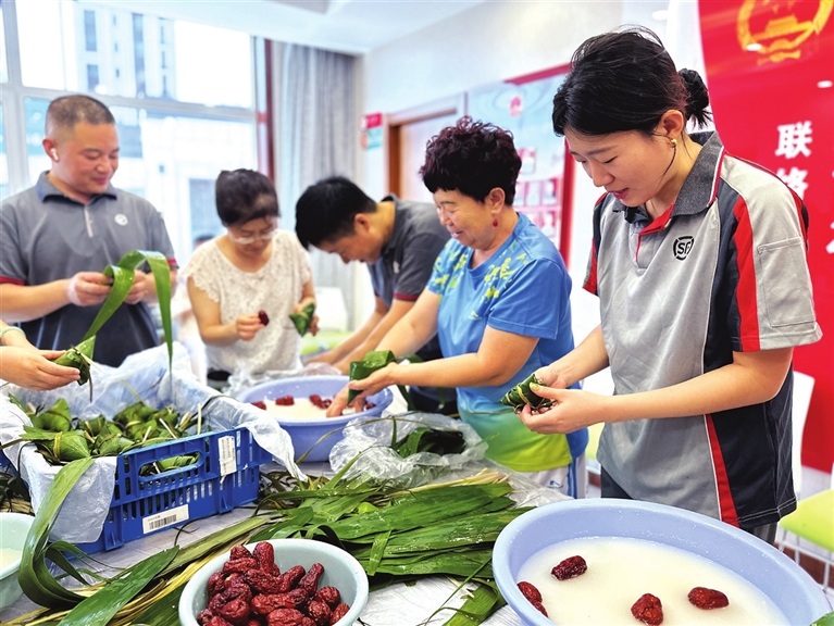 “小时候,每年会吃到奶奶亲手包的粽子。现在离开家乡,吃不到了。”23岁的快递员小赵说,最近派送的快递中,有不少是市民网购的粽子。花样多,也方便,却失去了对传统文化习俗的体验感和参与度,总感觉“差点意思”。这次学会,以后也能吃上自己包的粽子了。