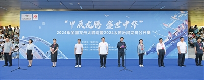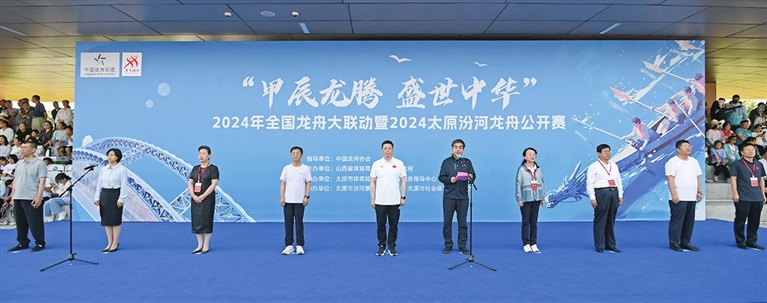 仲夏的太原,微风和煦,晴空万里,汾河晋阳桥段碧波荡漾,楼船画舫点缀其中,龙舟依次巡游亮相,沿河两岸彩旗飘舞。上午9时,大联动暨公开赛在雄壮的中华人民共和国国歌声中开幕,运动员、裁判员代表庄重宣誓后,韦韬、张新伟等为龙舟披红点睛,给参赛队伍送去美好的祝福。随后,韦韬宣布“2024太原汾河龙舟公开赛开赛”,在气势磅礴的威风锣鼓声中,巨龙翻飞,金狮狂舞,皮划艇、“水上飞人”等运动展演先后登场,献上精彩的水面视觉盛宴。展演结束后,发令枪响,公开组100米直道竞速小决赛率先开桨,斑斓的龙舟如离弦之箭,在河面上划出一道道波痕,各项目的角逐由此竞相展开。现场观众被选手劈波斩浪的气势和激情所带动,纷纷鼓掌叫好、呐喊助威。