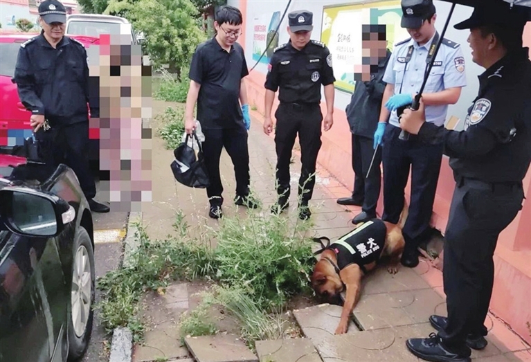 由于当时正在下雨,且沿途车多、人多,嗅源干扰因素多,给搜索工作增加了不少阻力。然而,办案民警毫不气馁,牵引着警犬继续冒雨搜寻。其间,警犬一路徘徊搜寻,时而快速推进,时而中途停顿。下午5时许,警犬追踪到酒店东面兴盛路便道时,突然作出示警反应,在一块松动的地砖旁左嗅嗅右嗅嗅,然后在跟前卧了下来。训导员迅速上前查看,果然在地砖下发现了一条金项链。经向当事人李女士核实,确为其丢失的金项链。