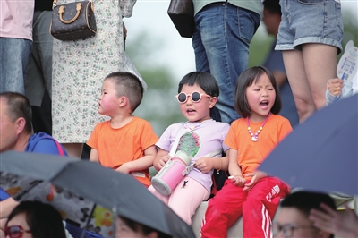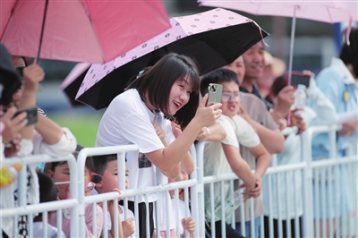 “山西队,加油!”7岁的林浩宇一边高呼口号,一边半蹲在路边,以遮阳伞作桨,左一下右一下地“划”了起来。
