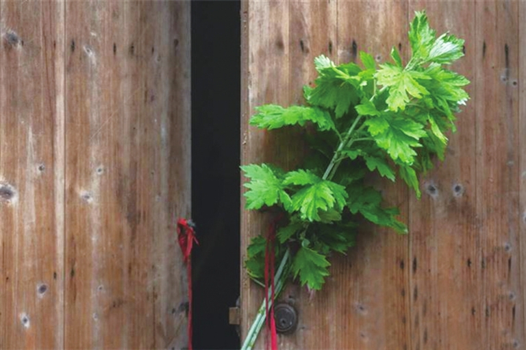 书中所说绿色的艾草和大红的榴花,是欢度端午必不可少的。依当时节俗,须在天未亮时,将艾草、榴花等绑成束插在门上。有的还将艾草编为“人形”,或干脆饰成“张天师”像。将艾剪成小虎,或在所剪彩虎上黏艾叶,戴在头上避邪。