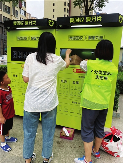 自窗户望去,每天都看见陆续有居民往里面投递自家的无用之物。工作人员身着“分类回收志愿者”绿马甲,亦不时守候在小区的数个回收柜旁,指导大家如何用手机开通并使用。