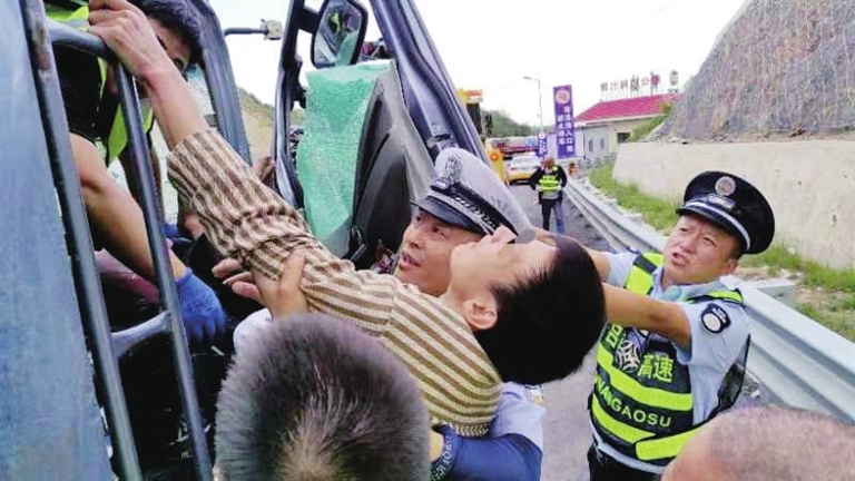 6月11日下午5时许,一辆蓝牌小货车经过薛公岭路段时,因司机不熟悉路况且驾驶经验不足,频繁使用刹车,导致刹车热衰减失灵,并与其他车辆发生碰撞。接到报警,一支队六大队民警迅速赶到现场,却发现受伤司机被困在车内无法动弹。见此情景,民警先是砸破已受损的挡风玻璃,又联合路政人员,用警车上的铁链和清障车绞盘钢索合力拉拽严重变形的驾驶室,扩展施救空间。经过十几分钟的努力,民警终于将司机抱出车外,送医急救。因救治及时,司机已脱离生命危险。