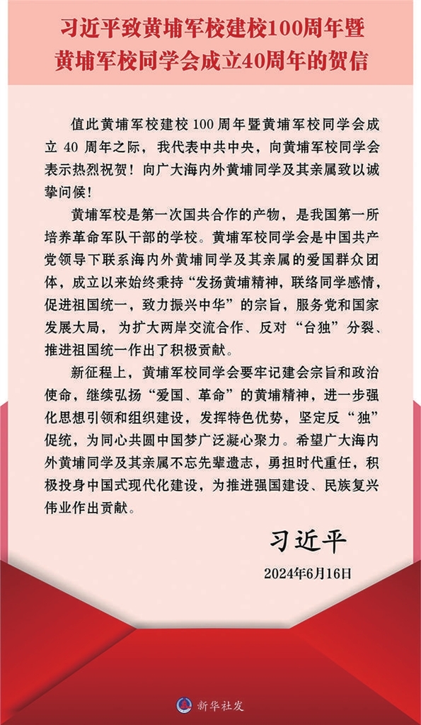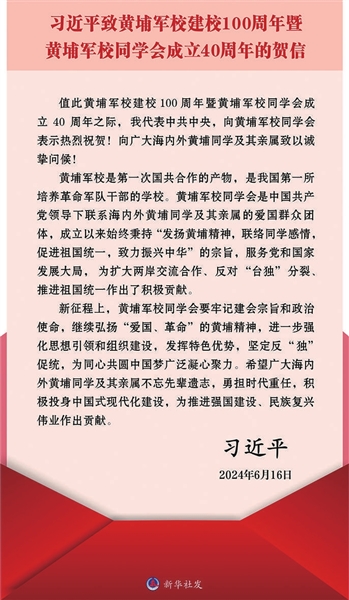 习近平强调,新征程上,黄埔军校同学会要牢记建会宗旨和政治使命,继续弘扬“爱国、革命”的黄埔精神,进一步强化思想引领和组织建设,发挥特色优势,坚定反“独”促统,为同心共圆中国梦广泛凝心聚力。希望广大海内外黄埔同学及其亲属不忘先辈遗志,勇担时代重任,积极投身中国式现代化建设,为推进强国建设、民族复兴伟业作出贡献。