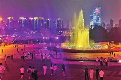 6月17日晚,长风商务区,绚丽音乐喷泉扮靓迷人夜景,吸引了众多市民纳凉娱乐,也带火了消夏夜经济。 王昕 摄