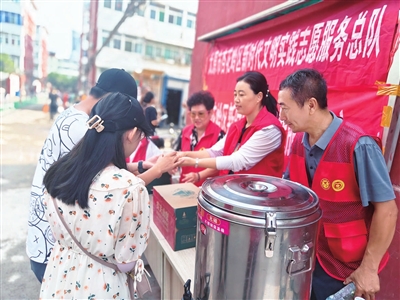 杏花岭街道教场巷社区联合杏花红志愿服务团队共13人组成志愿服务队,为考生和家长们免费送上矿泉水、绿豆汤等防暑降温饮品,并耐心提供咨询服务。