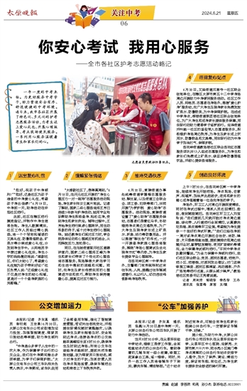 6月20日,文庙街道双塔寺一社区联合驻地单位,在辖区太原市第五十二中学考场周边开展助力中考便民服务活动。社区工作人员、网格员、志愿者在考场外,搭建“爱心护考”服务站,向广大考生及陪考家长免费发放矿泉水、防暑物资,为中考保驾护航。在成成中学考点,柳巷街道铁匠巷社区联合驻地单位,为广大考生和送考家长提供服务保障,用实际行动助力青春学子逐梦前行。迎泽街道并州路一社区的退役军人志愿者服务队,积极维护考场周边秩序,为考生及家长送上饮用水、防暑物品和文具等,用实际行动为中考学子加油打气、保驾护航。