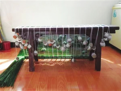 打帘子还需要一种工具叫帘蛋蛋,帘蛋蛋其实就是往上绕线线的短线轴。线轴一般是在胶泥里掺上短头发,捏成的两寸长、两头粗中间细的泥蛋蛋。也有用比重比较大的木棒刻制的。还有一种更为独特,是用小砖块儿打磨成的。