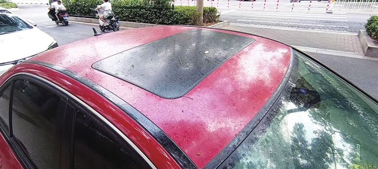 程女士说,每年夏秋季都会发现车上有这种黏状物,天气越热,树越多、枝叶越密,滴液似乎就越多。“把一些树叶、松针、小虫子都粘在挡风玻璃上了,一两个星期不洗车,就很影响视线。而且门把手、窗户玻璃、机盖上都是黏糊糊的,摸着‘腻腻歪歪’的。”