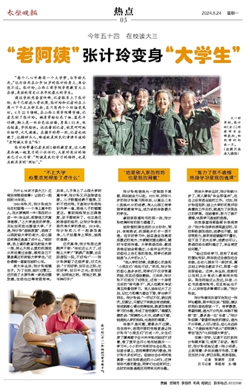 明年大学毕业时,张计玲就55岁了,有人调侃“毕业即退休”,社会上没有适合她的工作。对此,张计玲很坦然,她上大学的初衷并非奔着找工作去的,就是为了实现自己的梦想。在她看来,努力了就不遗憾,终身学习是她的选择。