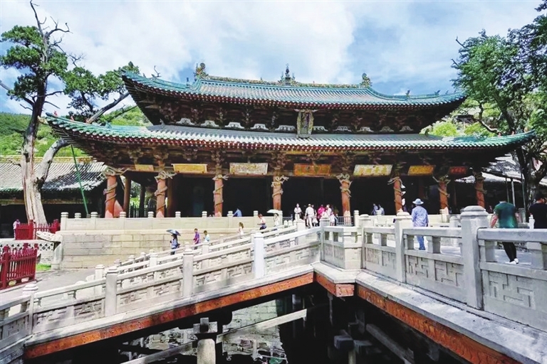 “十”字形古桥“鱼沼飞梁”位于圣母殿与献殿之间,是通往圣母殿的要道。北魏郦道元的《水经注》中记载:“沼西济山枕水,有唐叔虞祠,水侧有凉堂,结飞梁于水上。”可见,此桥早在1500多年前的北魏就已经存在。桥下是一个方形的鱼池,古人称圆为池,方为沼,而沼中多鱼,故名“鱼沼”。池中立有34根小八角石柱,柱上架斗拱,斗口十字相交,以承接梁、额与横梁,而梁上架有十字桥面,由中心向四周伸下阶梯连接四边地面,即“飞梁”。石柱在水中耐腐,而木构斗拱与梁枋又兼具韧性,桥板用石质则又耐磨,这种扬长避短的构思,让鱼沼飞梁得以长久保存下来。木斗拱与梁枋的交互作用,改变了桥面左右的推力传递,使桥面所受力道向下传至桥柱,桥柱荷载梁枋,而梁枋又承托桥面。这种巧妙的受力结构,让整个鱼沼飞梁成为凌驾于水面的完整平面结构。梁思成曾言:“此式石柱桥,在古画中偶见,实物则仅此一孤例,洵为可贵。”