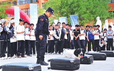 为帮助学生认清新型毒品的危害,活动请来缉毒犬“上课”。民警搬来6只行李箱,其中1只箱子放有伪装成饼干的“毒品”。缉毒犬三嗅两闻,就趴在1只箱子前示警,准确找出“毒品”。