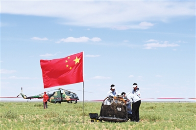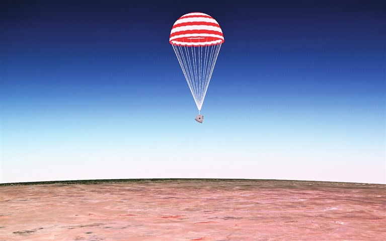 在降至距地面约10公里高度时,返回器打开降落伞,完成最后减速并保持姿态稳定,随后准确在预定区域平稳着陆。