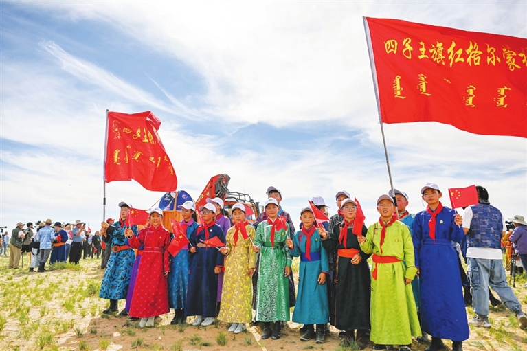 连日来,四子王旗旗府所在地乌兰花镇进出道路两侧路灯杆上挂着一面面鲜艳的五星红旗,大街上打出一条条欢迎嫦娥六号返回器凯旋的横幅标语。