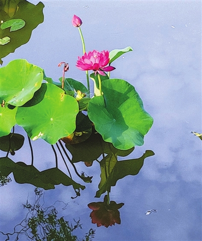 选择荷花不太稠密的地方,寻找理想的花姿花色,可以单拍,也可以拍其倒影。