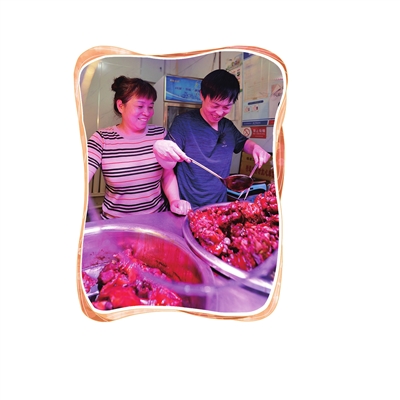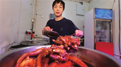 每天早晨6时,当大多数人还在被窝里沉睡时,杨水绛就开始了一天的忙碌,每天早晨8点半开门,晚上10点半闭店。日复一日,年复一年,长期的劳碌让他腰椎间盘出现了问题。“老板挑两个大猪蹄。”这时,杨水绛忍着疼痛,直起腰,拿起叉子,戳起猪蹄,称重装进塑料袋,动作娴熟麻利。时间久了,顾客和杨水绛处得像自家人一般,接过袋子总会叮嘱一句:“老板,腰又不舒服了吧,多注意身体啊。”