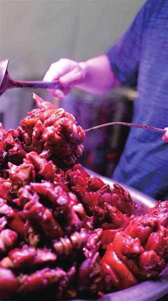 天刚蒙蒙亮,杨水绛就去市场上采购猪蹄等新鲜食材。“早点去才能买到好猪蹄。”杨水绛对此十分认真。每天采购回来的猪蹄,先清洗干净,再把猪蹄缝隙里的毛割掉。“我从不用火去烧猪蹄上的毛,那样会有一股焦味儿,影响口感。”杨水绛说。