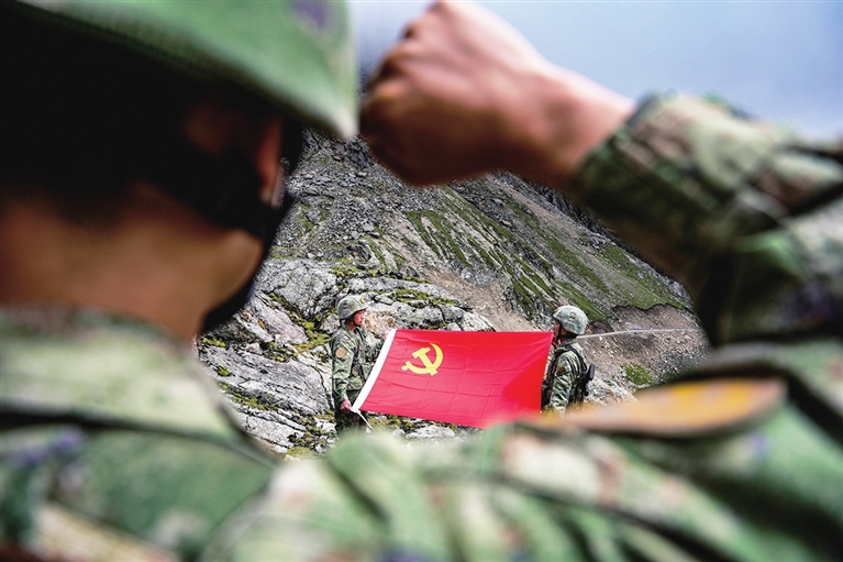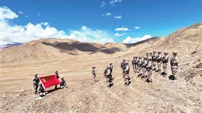 驻守在海拔4676米的西藏军区某边防团标沙拉错哨所官兵开展向党旗宣誓活动(6月29日摄)。