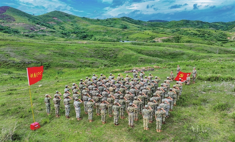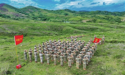 陆军第71集团军某旅组织官兵在野外驻训点举行重温入党誓词活动(无人机照片,6月29日摄)。
