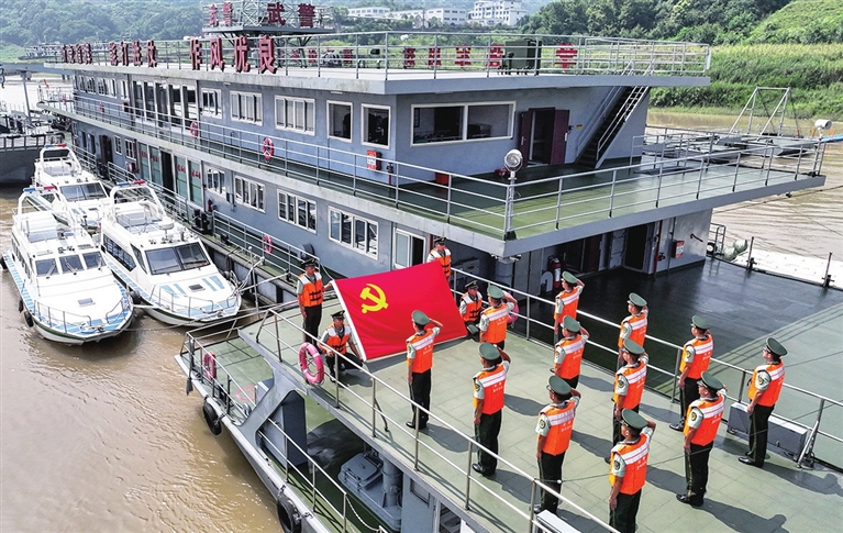 武警重庆总队船艇支队组织党员举行重温入党誓词活动(6月30日摄)。 新华社 发