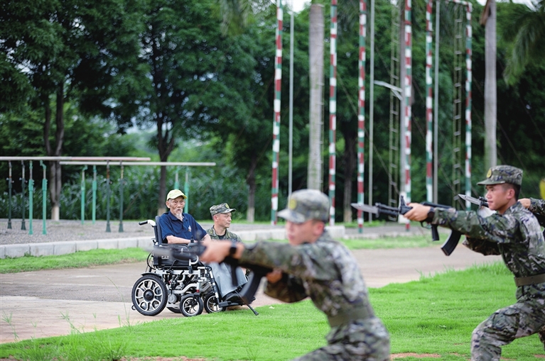 武警广西总队百色支队开展主题党日活动,邀请抗战老兵孙洪秀现场观摩刺杀训练(6月29日摄)。
