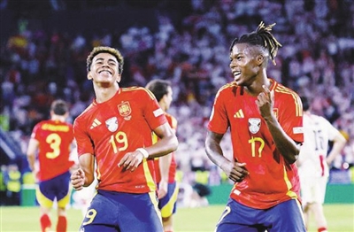 而且,西班牙强大的青训正在把国脚年龄一降再降。带着学校作业来参赛的边锋亚马尔才16岁,几乎是场场首发、打满全场,而且越踢越好。另一侧的威廉姆斯也才21岁,本场比赛打进一球。两位“00后”在边路不断地“突突突”,让原本就有中场优势的西班牙队如虎添翼,成为在本届赛事一路奏凯的关键。