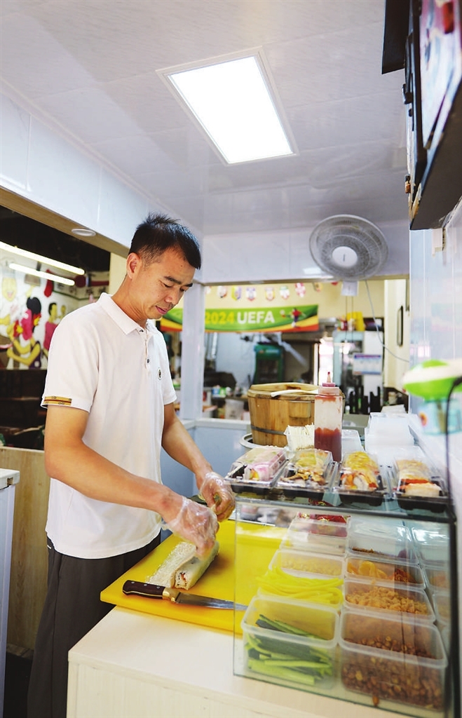 “叔叔,我要一份浓情芝士寿司、一份培根寿司、一份肉松玉米寿司。”上初中一年级的赵同学正在给自己和弟弟买寿司。“这家店的寿司物美价廉,特别好吃,我在雷锋小学时就开始吃了。”赵同学推荐说。朱新世接到订单后熟练地制作,甚至酱料的调配都恰到好处,符合这位“老”顾客的口味,这是属于他们的默契。对于生活在桃园二巷附近的孩子们来说,一品寿司是放学路上的美味,是父母带给自己的惊喜,是陪伴他们童年的光阴味道。