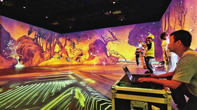 在这里,《落花游鱼图》借助光影技术的魔力,焕发出新的生命力。游鱼在墨色山水间穿梭,仿佛随时会跃出画面。《溪山无尽图》赋山水之彩,带记者步入画中,或在行进中留下印记……一幅幅静止的中国古代绘画,穿越时间阻隔,突破空间距离,在这里变成了一个个生动的画中世界。