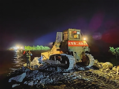 已是7日凌晨三点,武警第二机动总队二级上士李贵权左手挥着红色指挥旗,右手握着手电,指挥推土机把一块块大石料推进决口处。