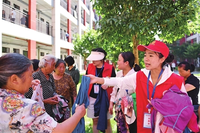 7月7日,在华容县职业中专安置点,志愿者(右)为转移安置的群众分发爱心人士捐赠的衣物。目前,华容县已在城区设立华容县职业中专、状元湖实验学校、实验小学、章华学校四个安置点,共转移安置受灾群众3224人。 新华社 发