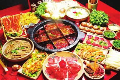 在重庆的大街上,饭店餐馆举目可见,最多的要属火锅店。中午时分,我们走进了网评人气高的一家火锅店。服务员端来一个硕大的铜火锅,先放入一块红油化开,再倒入佐料、火锅汤,不一会儿,红红的、散发着麻辣香味的汤就咕嘟咕嘟滚开了。