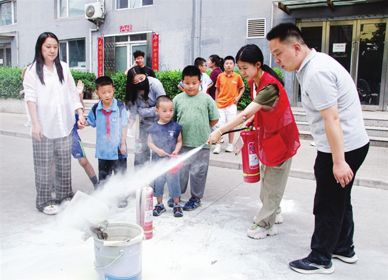 图为未成年人代表按照操作步骤演练和体验消防器材。