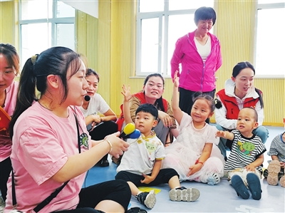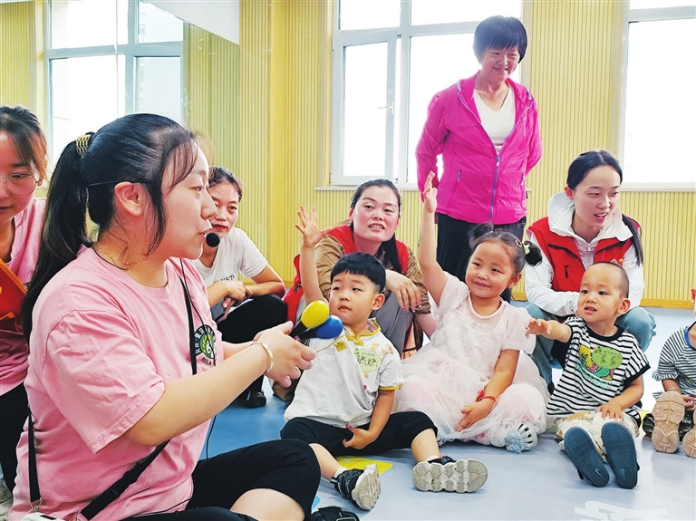 玉园南社区的暑期托管班上,孩子们与志愿者做游戏。