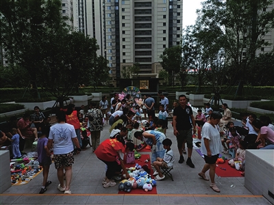 7月8日傍晚,中海宸悦小区的院里,摆了一排小摊位。“摊主”“顾客”都是居民,叫卖玩具、图书、学习用品、手工作品、小饰品等。
