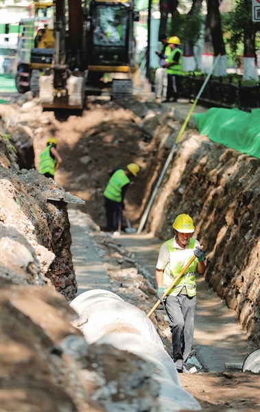 7月10日,太原市市政公共设施建设管理中心负责的新民北街雨污分流混接点改造项目现场,工作人员正在铺设管道。该项目改造后将实现雨污分流,进一步提升城市汛期排涝能力。 王韵菲 狄佳玮 摄